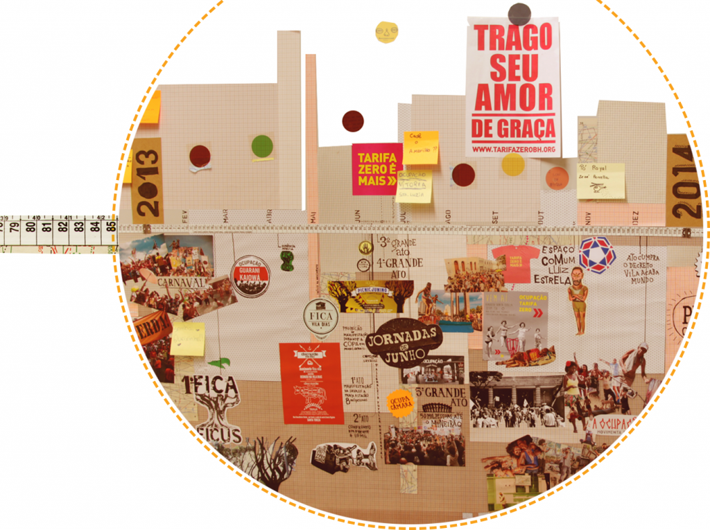 O mapeamento das insurgências e suas respectivas datas foi feito de maneira coletiva em documento aberto e a base principal de dados utilizada foi o Facebook, além de termos incorporadas as intervenções deixadas por visitantes através de post-its. Dessa forma, a linha esteve em construção durante todo o processo, ganhando maior visibilidade na imensa concentração de interferências, cores e marcas em 2013, com as jornadas de junho.
