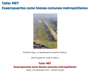 Os investigadores Janaina Marx e Hernan Espinoza participarão como palestrantes em 3 de setembro (quinta-feita) do evento““Taller MET (Mariscal Sucre|Elliniko|Tempelhof)”” en la Flacso – Ecuador. O evento, organizado pelo acadêmico e investigador da Universidade de Atenas Nicholas Anastasopoulos*, debaterá os bienes comunes metropolitanos, enfatizando o caso do antigo aeroporto de Quito.
